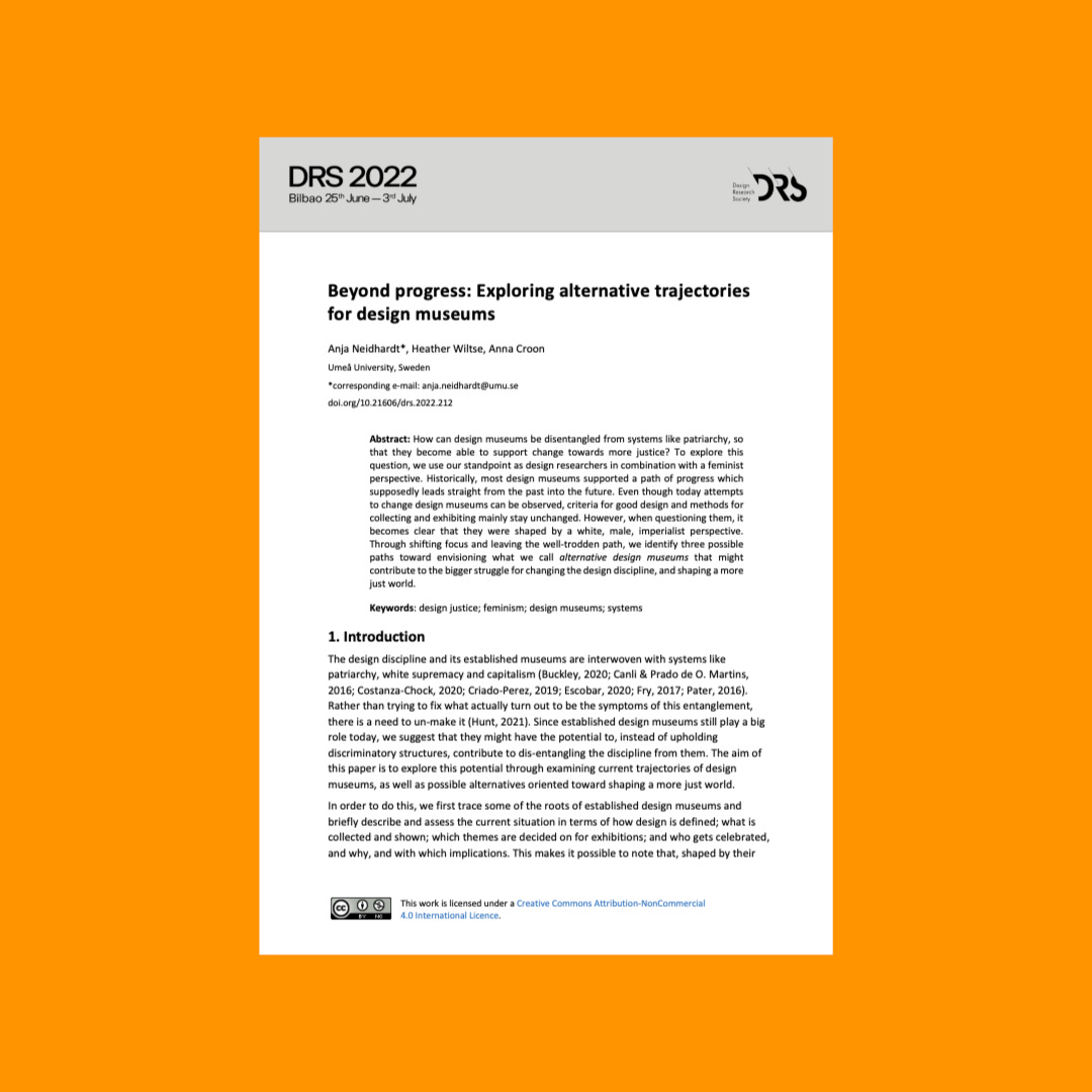 Anja Neidhardt, Heather Wiltse, and Anna Croon: Beyond Progress: Exploring Alternative Trajectories for Design Museums. DRS2022: Bilbao, 2022.