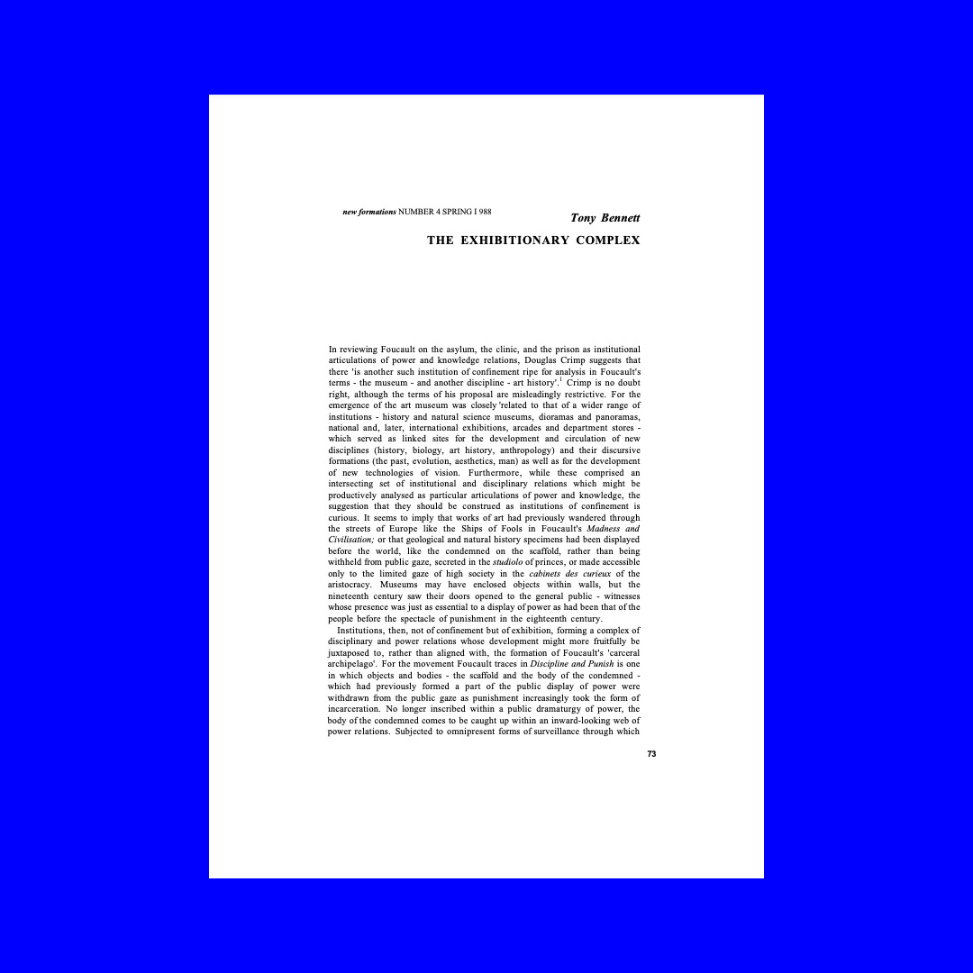 Tony Benett: The exhibitonary complex. In: new formations NUMBER 4 SPRING, 1988, pp. 73–102.